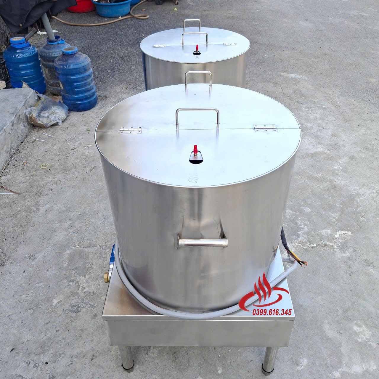 Hình ảnh thực tế nồi nấu phở inox 3 thanh nhiệt với hệ thống điều khiển tích hợp và van xả đồng.